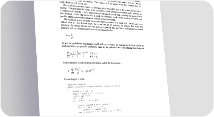 Given our assumption that p > q, the probability drops exponentially as the number of blocks the attacker has to catch up with increases. With the odds against him, if he doesn't make a lucky lunge forward early on, his chances become vanishingly small as he falls further behind. We now consider how long the recipient of a new transaction needs to wait before being sufficiently certain the sender can't change the transaction. We assume the sender is an attacker who wants to make the recipient believe he paid him for a while, then switch it to pay back to himself after some time has passed. The receiver will be alerted when that happens, but the sender hopes it will be too late. The receiver generates a new key pair and gives the public key to the sender shortly before signing. This prevents the sender from preparing a chain of blocks ahead of time by working on it continuously until he is lucky enough to get far enough ahead, then executing the transaction at that moment. Once the transaction is sent, the dishonest sender starts working in secret on a parallel chain containing an alternate version of his transaction. The recipient waits until the transaction has been added to a block and z blocks have been linked after it. He doesn't know the exact amount of progress the attacker has made, but assuming the honest blocks took the average expected time per block, the attacker's potential progress will be a Poisson distribution with expected value: =z q p To get the probability the attacker could still catch up now, we multiply the Poisson density for each amount of progress he could have made by the probability he could catch up from that point: ∞ k − z−k ∑e ⋅q/p if k≤z k! { 1 if kz} k=0 Rearranging to avoid summing the infinite tail of the distribution... z k − e z−k 1−∑ k! 1−q/p k=0 Converting to C code... #include double AttackerSuccessProbability(double q, int z) { double p = 1.0 - q; double lambda = z * (q / p); double sum = 1.0; int i, k; for (k = 0; k <= z; k++) { double poisson = exp(-lambda); for (i = 1; i <= k; i++) poisson *= lambda / i; sum -= poisson * (1 - pow(q / p, z - k)); } return sum; } 7