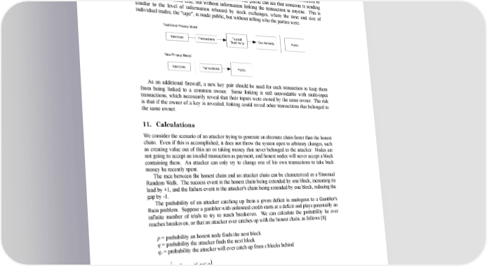 10. Privacy The traditional banking model achieves a level of privacy by limiting access to information to the parties involved and the trusted third party. The necessity to announce all transactions publicly precludes this method, but privacy can still be maintained by breaking the flow of information in another place: by keeping public keys anonymous. The public can see that someone is sending an amount to someone else, but without information linking the transaction to anyone. This is similar to the level of information released by stock exchanges, where the time and size of individual trades, the "tape", is made public, but without telling who the parties were. Traditional Privacy Model Identities Transactions Trusted Counterparty Public Third Party New Privacy Model Identities Transactions Public As an additional firewall, a new key pair should be used for each transaction to keep them from being linked to a common owner. Some linking is still unavoidable with multi-input transactions, which necessarily reveal that their inputs were owned by the same owner. The risk is that if the owner of a key is revealed, linking could reveal other transactions that belonged to the same owner. 11. Calculations We consider the scenario of an attacker trying to generate an alternate chain faster than the honest chain. Even if this is accomplished, it does not throw the system open to arbitrary changes, such as creating value out of thin air or taking money that never belonged to the attacker. Nodes are not going to accept an invalid transaction as payment, and honest nodes will never accept a block containing them. An attacker can only try to change one of his own transactions to take back money he recently spent. The race between the honest chain and an attacker chain can be characterized as a Binomial Random Walk. The success event is the honest chain being extended by one block, increasing its lead by +1, and the failure event is the attacker's chain being extended by one block, reducing the gap by -1. The probability of an attacker catching up from a given deficit is analogous to a Gambler's Ruin problem. Suppose a gambler with unlimited credit starts at a deficit and plays potentially an infinite number of trials to try to reach breakeven. We can calculate the probability he ever reaches breakeven, or that an attacker ever catches up with the honest chain, as follows [8]: p = probability an honest node finds the next block q = probability the attacker finds the next block qz = probability the attacker will ever catch up from z blocks behind q = 1 if p≤q z { z } q/ p if pq 6
