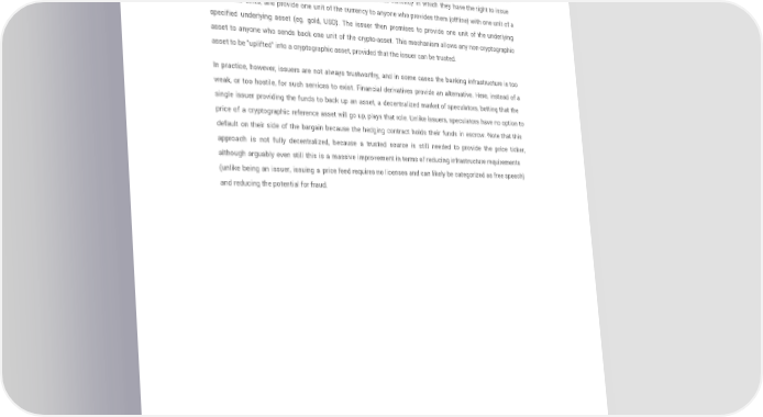 Such a contract would have significant potential in crypto-commerce. One of the main problems cited about cryptocurrency is the fact that it's volatile; although many users and merchants may want the security and convenience of dealing with cryptographic assets, they many not wish to face that prospect of losing 23% of the value of their funds in a single day. Up until now, the most commonly proposed solution has been issuer-backed assets; the idea is that an issuer creates a sub-currency in which they have the right to issue and revoke units, and provide one unit of the currency to anyone who provides them (offline) with one unit of a specified underlying asset (eg. gold, USD). The issuer then promises to provide one unit of the underlying asset to anyone who sends back one unit of the crypto-asset. This mechanism allows any non-cryptographic asset to be "uplifted" into a cryptographic asset, provided that the issuer can be trusted. In practice, however, issuers are not always trustworthy, and in some cases the banking infrastructure is too weak, or too hostile, for such services to exist. Financial derivatives provide an alternative. Here, instead of a single issuer providing the funds to back up an asset, a decentralized market of speculators, betting that the price of a cryptographic reference asset will go up, plays that role. Unlike issuers, speculators have no option to default on their side of the bargain because the hedging contract holds their funds in escrow. Note that this approach is not fully decentralized, because a trusted source is still needed to provide the price ticker, although arguably even still this is a massive improvement in terms of reducing infrastructure requirements (unlike being an issuer, issuing a price feed requires no licenses and can likely be categorized as free speech) and reducing the potential for fraud. Page 21 ethereum.org