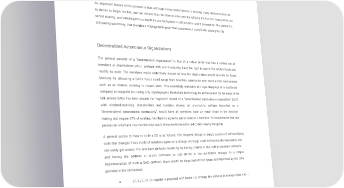 simplified payment verification-like proof of ownership of the block at that particular index in the tree. When a user wants to re-download their file, they can use a micropayment channel protocol (eg. pay 1 szabo per 32 kilobytes) to recover the file; the most fee-efficient approach is for the payer not to publish the transaction until the end, instead replacing the transaction with a slightly more lucrative one with the same nonce after every 32 kilobytes. An important feature of the protocol is that, although it may seem like one is trusting many random nodes not to decide to forget the file, one can reduce that risk down to near-zero by splitting the file into many pieces via secret sharing, and watching the contracts to see each piece is still in some node's possession. If a contract is still paying out money, that provides a cryptographic proof that someone out there is still storing the file. Decentralized Autonomous Organizations The general concept of a "decentralized organization" is that of a virtual entity that has a certain set of members or shareholders which, perhaps with a 67% majority, have the right to spend the entity's funds and modify its code. The members would collectively decide on how the organization should allocate its funds. Methods for allocating a DAO's funds could range from bounties, salaries to even more exotic mechanisms such as an internal currency to reward work. This essentially replicates the legal trappings of a traditional company or nonprofit but using only cryptographic blockchain technology for enforcement. So far much of the talk around DAOs has been around the "capitalist" model of a "decentralized autonomous corporation" (DAC) with dividend-receiving shareholders and tradable shares; an alternative, perhaps described as a "decentralized autonomous community", would have all members have an equal share in the decision making and require 67% of existing members to agree to add or remove a member. The requirement that one person can only have one membership would then need to be enforced collectively by the group. A general outline for how to code a DO is as follows. The simplest design is simply a piece of self-modifying code that changes if two thirds of members agree on a change. Although code is theoretically immutable, one can easily get around this and have de-facto mutability by having chunks of the code in separate contracts, and having the address of which contracts to call stored in the modifiable storage. In a simple implementation of such a DAO contract, there would be three transaction types, distinguished by the data provided in the transaction: ● [0,i,K,V] to register a proposal with index i to change the address at storage index K to value V ● [0,i] to register a vote in favor of proposal i ● [2,i] to finalize proposal i if enough votes have been made The contract would then have clauses for each of these. It would maintain a record of all open storage changes, along with a list of who voted for them. It would also have a list of all members. When any storage Page 23 ethereum.org