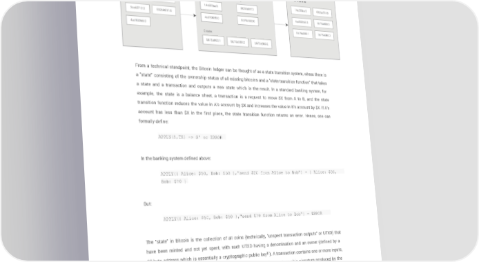 Bitcoin As A State Transition System From a technical standpoint, the Bitcoin ledger can be thought of as a state transition system, where there is a "state" consisting of the ownership status of all existing bitcoins and a "state transition function" that takes a state and a transaction and outputs a new state which is the result. In a standard banking system, for example, the state is a balance sheet, a transaction is a request to move $X from A to B, and the state transition function reduces the value in A's account by $X and increases the value in B's account by $X. If A's account has less than $X in the first place, the state transition function returns an error. Hence, one can formally define: APPLY(S,TX) > S' or ERROR In the banking system defined above: APPLY({ Alice: $50, Bob: $50 },"send $20 from Alice to Bob") = { Alice: $30, Bob: $70 } But: APPLY({ Alice: $50, Bob: $50 },"send $70 from Alice to Bob") = ERROR The "state" in Bitcoin is the collection of all coins (technically, "unspent transaction outputs" or UTXO) that have been minted and not yet spent, with each UTXO having a denomination and an owner (defined by a [1] 20-byte address which is essentially a cryptographic public key ). A transaction contains one or more inputs, with each input containing a reference to an existing UTXO and a cryptographic signature produced by the private key associated with the owner's address, and one or more outputs, with each output containing a new UTXO to be added to the state. Page 5 ethereum.org