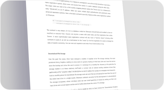 Identity and Reputation Systems The earliest alternative cryptocurrency of all, Namecoin, attempted to use a Bitcoin-like blockchain to provide a name registration system, where users can register their names in a public database alongside other data. The major cited use case is for a DNS system, mapping domain names like "bitcoin.org" (or, in Namecoin's case, "bitcoin.bit") to an IP address. Other use cases include email authentication and potentially more advanced reputation systems. Here is the basic contract to provide a Namecoin-like name registration system on Ethereum: if !contract.storage[tx.data[0]]: contract.storage[tx.data[0]] = tx.data[1] The contract is very simple; all it is is a database inside the Ethereum network that can be added to, but not modified or removed from. Anyone can register a name with some value, and that registration then sticks forever. A more sophisticated name registration contract will also have a "function clause" allowing other contracts to query it, as well as a mechanism for the "owner" (ie. the first registerer) of a name to change the data or transfer ownership. One can even add reputation and web-of-trust functionality on top. Decentralized File Storage Over the past few years, there have emerged a number of popular online file storage startups, the most prominent being Dropbox, seeking to allow users to upload a backup of their hard drive and have the service store the backup and allow the user to access it in exchange for a monthly fee. However, at this point the file storage market is at times relatively inefficient; a cursory look at various existing solutions shows that, particularly at the "uncanny valley" 20-200 GB level at which neither free quotas nor enterprise-level discounts kick in, monthly prices for mainstream file storage costs are such that you are paying for more than the cost of the entire hard drive in a single month. Ethereum contracts can allow for the development of a decentralized file storage ecosystem, where individual users can earn small quantities of money by renting out their own hard drives and unused space can be used to further drive down the costs of file storage. The key underpinning piece of such a device would be what we have termed the "decentralized Dropbox contract". This contract works as follows. First, one splits the desired data up into blocks, encrypting each block for privacy, and builds a Merkle tree out of it. One then makes a contract with the rule that, every N blocks, the contract would pick a random index in the Merkle tree (using the previous block hash, accessible from contract code, as a source of randomness), and give X ether to the first entity to supply a transaction with a Page 22 ethereum.org