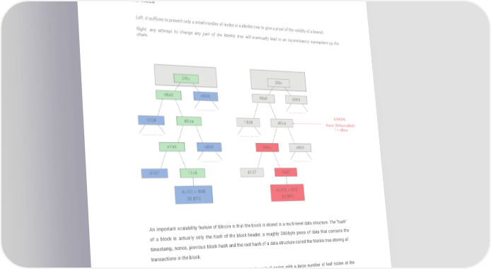 Merkle Trees Left: it suffices to present only a small number of nodes in a Merkle tree to give a proof of the validity of a branch. Right: any attempt to change any part of the Merkle tree will eventually lead to an inconsistency somewhere up the chain. An important scalability feature of Bitcoin is that the block is stored in a multi-level data structure. The "hash" of a block is actually only the hash of the block header, a roughly 200-byte piece of data that contains the timestamp, nonce, previous block hash and the root hash of a data structure called the Merkle tree storing all transactions in the block. A Merkle tree is a type of binary tree, composed of a set of nodes with a large number of leaf nodes at the bottom of the tree containing the underlying data, a set of intermediate nodes where each node is the hash of its two children, and finally a single root node, also formed from the hash of its two children, representing the "top" of the tree. The purpose of the Merkle tree is to allow the data in a block to be delivered piecemeal: a node can download only the header of a block from one source, the small part of the tree relevant to them from Page 9 ethereum.org