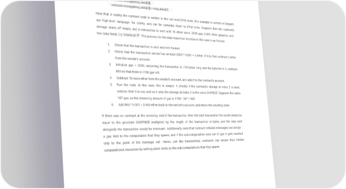 For example, suppose that the contract's code is: if !contract.storage[msg.data[0]]: contract.storage[msg.data[0]] = msg.data[1] Note that in reality the contract code is written in the low-level EVM code; this example is written in Serpent, our high-level language, for clarity, and can be compiled down to EVM code. Suppose that the contract's storage starts off empty, and a transaction is sent with 10 ether value, 2000 gas, 0.001 ether gasprice, and [3] two data fields: [ 2, 'CHARLIE' ] . The process for the state transition function in this case is as follows: 1. Check that the transaction is valid and well formed. 2. Check that the transaction sender has at least 2000 * 0.001 = 2 ether. If it is, then subtract 2 ether from the sender's account. 3. Initialize gas = 2000; assuming the transaction is 170 bytes long and the byte-fee is 5, subtract 850 so that there is 1150 gas left. 4. Subtract 10 more ether from the sender's account, and add it to the contract's account. 5. Run the code. In this case, this is simple: it checks if the contract's storage at index 2 is used, notices that it is not, and so it sets the storage at index 2 to the value CHARLIE. Suppose this takes 187 gas, so the remaining amount of gas is 1150 - 187 = 963 6. Add 963 * 0.001 = 0.963 ether back to the sender's account, and return the resulting state. If there was no contract at the receiving end of the transaction, then the total transaction fee would simply be equal to the provided GASPRICE multiplied by the length of the transaction in bytes, and the data sent alongside the transaction would be irrelevant. Additionally, note that contract-initiated messages can assign a gas limit to the computation that they spawn, and if the sub-computation runs out of gas it gets reverted only to the point of the message call. Hence, just like transactions, contracts can secure their limited computational resources by setting strict limits on the sub-computations that they spawn. Page 16 ethereum.org