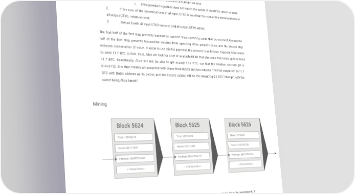 The state transition function APPLY(S,TX) > S' can be defined roughly as follows: 1. For each input in TX: i. If the referenced UTXO is not in S, return an error. ii. If the provided signature does not match the owner of the UTXO, return an error. 2. If the sum of the denominations of all input UTXO is less than the sum of the denominations of all output UTXO, return an error. 3. Return S with all input UTXO removed and all output UTXO added. The first half of the first step prevents transaction senders from spending coins that do not exist, the second half of the first step prevents transaction senders from spending other people's coins, and the second step enforces conservation of value. In order to use this for payment, the protocol is as follows. Suppose Alice wants to send 11.7 BTC to Bob. First, Alice will look for a set of available UTXO that she owns that totals up to at least 11.7 BTC. Realistically, Alice will not be able to get exactly 11.7 BTC; say that the smallest she can get is 6+4+2=12. She then creates a transaction with those three inputs and two outputs. The first output will be 11.7 BTC with Bob's address as its owner, and the second output will be the remaining 0.3 BTC "change", with the owner being Alice herself. Mining If we had access to a trustworthy centralized service, this system would be trivial to implement; it could simply be coded exactly as described. However, with Bitcoin we are trying to build a decentralized currency system, so we will need to combine the state transition system with a consensus system in order to ensure that everyone agrees on the order of transactions. Bitcoin's decentralized consensus process requires nodes in the network to continuously attempt to produce packages of transactions called "blocks". The network is intended to produce roughly one block every ten minutes, with each block containing a timestamp, a nonce, a reference to (ie. hash of) the Page 6 ethereum.org