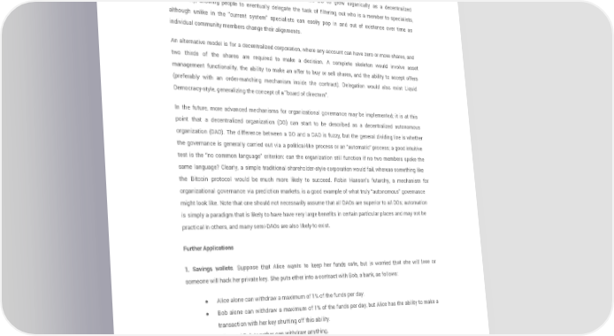 change gets to two thirds of members voting for it, a finalizing transaction could execute the change. A more sophisticated skeleton would also have built-in voting ability for features like sending a transaction, adding members and removing members, and may even provide for Liquid Democracy-style vote delegation (ie. anyone can assign someone to vote for them, and assignment is transitive so if A assigns B and B assigns C then C determines A's vote). This design would allow the DO to grow organically as a decentralized community, allowing people to eventually delegate the task of filtering out who is a member to specialists, although unlike in the "current system" specialists can easily pop in and out of existence over time as individual community members change their alignments. An alternative model is for a decentralized corporation, where any account can have zero or more shares, and two thirds of the shares are required to make a decision. A complete skeleton would involve asset management functionality, the ability to make an offer to buy or sell shares, and the ability to accept offers (preferably with an order-matching mechanism inside the contract). Delegation would also exist Liquid Democracy-style, generalizing the concept of a "board of directors". In the future, more advanced mechanisms for organizational governance may be implemented; it is at this point that a decentralized organization (DO) can start to be described as a decentralized autonomous organization (DAO). The difference between a DO and a DAO is fuzzy, but the general dividing line is whether the governance is generally carried out via a political-like process or an “automatic” process; a good intuitive test is the “no common language” criterion: can the organization still function if no two members spoke the same language? Clearly, a simple traditional shareholder-style corporation would fail, whereas something like the Bitcoin protocol would be much more likely to succeed. Robin Hanson’s futarchy, a mechanism for organizational governance via prediction markets, is a good example of what truly “autonomous” governance might look like. Note that one should not necessarily assume that all DAOs are superior to all DOs; automation is simply a paradigm that is likely to have have very large benefits in certain particular places and may not be practical in others, and many semi-DAOs are also likely to exist. Further Applications 1. Savings wallets. Suppose that Alice wants to keep her funds safe, but is worried that she will lose or someone will hack her private key. She puts ether into a contract with Bob, a bank, as follows: ● Alice alone can withdraw a maximum of 1% of the funds per day. ● Bob alone can withdraw a maximum of 1% of the funds per day, but Alice has the ability to make a transaction with her key shutting off this ability. ● Alice and Bob together can withdraw anything. Normally, 1% per day is enough for Alice, and if Alice wants to withdraw more she can contact Bob for help. If Alice's key gets hacked, she runs to Bob to move the funds to a new contract. If she loses her key, Bob will get the funds out eventually. If Bob turns out to be malicious, then she can turn off his ability to withdraw. Page 24 ethereum.org