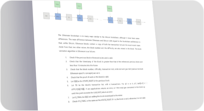 Blockchain and Mining The Ethereum blockchain is in many ways similar to the Bitcoin blockchain, although it does have some differences. The main difference between Ethereum and Bitcoin with regard to the blockchain architecture is that, unlike Bitcoin, Ethereum blocks contain a copy of both the transaction list and the most recent state. Aside from that, two other values, the block number and the difficulty, are also stored in the block. The block validation algorithm in Ethereum is as follows: 1. Check if the previous block referenced exists and is valid. 2. Check that the timestamp of the block is greater than that of the referenced previous block and less than 15 minutes into the future 3. Check that the block number, difficulty, transaction root, uncle root and gas limit (various low-level Ethereum-specific concepts) are valid. 4. Check that the proof of work on the block is valid. 5. Let S[0] be the STATE_ROOT of the previous block. 6. Let TX be the block's transaction list, with n transactions. For all in in 0...n-1, setS[i+1] = APPLY(S[i],TX[i]). If any applications returns an error, or if the total gas consumed in the block up until this point exceeds the GASLIMIT, return an error. 7. Let S_FINAL be S[n], but adding the block reward paid to the miner. 8. Check if S_FINAL is the same as the STATE_ROOT. If it is, the block is valid; otherwise, it is not valid. Page 18 ethereum.org