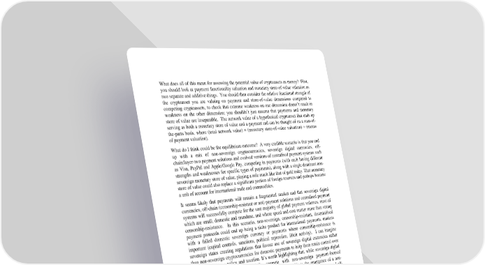 What does all of this mean for assessing the potential value of cryptoassets as money? First, you should look at payment functionality valuation and monetary store-of-value valuation as two separate and additive things. You should then consider the relative functional strength of the cryptoasset you are valuing on payment and store-of-value dimensions compared to competing cryptoassets, to check that extreme weakness on one dimension doesn’t result in weakness on the other dimension; you shouldn’t just assume that payments and monetary store of value are inseparable. The network value of a hypothetical cryptoasset that ends up serving as both a monetary store of value and a payment rail can be thought of on a sum-of- the-parts basis, where (total network value) = (monetary store-of-value valuation) + (means of payment valuation). What do I think could be the equilibrium outcome? A very credible scenario is that you end up with a mix of non-sovereign cryptocurrencies, sovereign digital currencies, off- chain/layer-two payment solutions and evolved versions of centralised payment systems such as Visa, PayPal and Apple/Google Pay, competing in payments (with each having different strengths and weaknesses for specific types of payments), along with a single dominant non- sovereign monetary store of value, playing a role much like that of gold today. That monetary store of value could also replace a significant portion of foreign reserves and perhaps become a unit of account for international trade and commodities. It seems likely that payments will remain a fragmented market and that sovereign digital currencies, off-chain (censorship-resistant or not) payment solutions and centralised payment systems will successfully compete for the vast majority of global payment volumes, most of which are small, domestic and mundane, and where speed and cost matter more than strong censorship-resistance. In this scenario, non-sovereign, censorship-resistant, decentralised payment protocols could end up being a niche product for international payments, markets with a failed domestic sovereign currency or payments where censorship-resistance is important (capital controls, sanctions, political repression, illicit activity). I can imagine sovereign states creating regulations that favour use of sovereign digital currencies rather than non-sovereign cryptocurrencies for domestic payments to help them retain control over domestic monetary policy and taxation. It’s worth highlighting that, while sovereign digital currencies will probably successfully compete with non-sovereign payment-focused cryptocurrencies for payment volumes, they will likely facilitate the emergence of a non- sovereign monetary store of value, since their existence will help to eliminate the on- and off- ramp banking issues and friction currently involved in exchanging fiat for crypto. To preview what follows, monetary store-of-value functionality is potentially far more valuable than payments functionality. Thus, if a monetary store-of-value cryptocurrency also works well as a means of payment, that’s just a little additional value upside. What matters far more to us as investors is store of value. Payments Proceeding from the general observations at the beginning of this paper, a means of payment, examined in isolation from the monetary store-of-value function, is just another utility protocol where the value of the token cannot decouple from M = PQ/V of the computing resource maintaining the payment blockchain. Payments on a large scale must be cost efficient. To the extent a cryptoasset is both a store of value and major payment rail, in order to be cost-efficient and competitive as a means of payment, the payment part will have to be economically disassociated from the store-of-value function, such that the incremental M for payments still equals PQ/V for the computing resources facilitating the payment function and where V can go very high. This dissociation can be achieved by way of an explicit 15