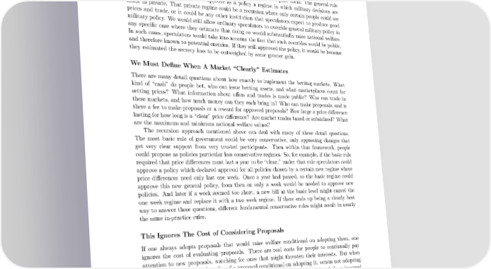 The Military Needs Secrecy, While Markets Are Public This form of government allows public decisions, but does not require them. The general rule of government could be used to approve as a policy a regime in which military decisions are made in private. That private regime could be a recursion where only certain people could see prices and trade, or it could be any other institution that speculators expect to produce good military policy. We would still allow ordinary speculators to override general military policy in any specific case where they estimate that doing so would substantially raise national welfare. In such cases, speculators would take into account the fact that such overrides would be public, and therefore known to potential enemies. If they still approved the policy, it would be because they estimated the secrecy loss to be outweighed by some greater gain. WeMust Define When A Market “Clearly” Estimates There are many detail questions about how exactly to implement the betting markets. What kind of “cash” do people bet, who can issue betting assets, and what marketplaces count for setting prices? What information about offers and trades is made public? Who can trade in these markets, and how much money can they each bring in? Who can make proposals, and is there a fee to make proposals or a reward for approved proposals? How large a price difference lasting for how long is a “clear” price difference? Are market trades taxed or subsidized? What are the maximum and minimum national welfare values? The recursion approach mentioned above can deal with many of these detail questions. The most basic rule of government could be very conservative, only approving changes that get very clear support from very trusted participants. Then within that framework, people could propose as policies particular less conservative regimes. So, for example, if the basic rule required that price differences must last a year to be “clear,” under that rule speculators could approve a policy which declared approval for all policies chosen by a certain new regime where price differences need only last one week. Once a year had passed, so the basic regime could approve this new general policy, from then on only a week would be needed to approve new policies. And later if a week seemed too short, a new bill at the basic level might cancel the one week regime and replace it with a two week regime. If there ends up being a clearly best way to answer these questions, different fundamental conservative rules might result in nearly the same in-practice rules. This Ignores The Cost of Considering Proposals If one always adopts proposals that would raise welfare conditional on adopting them, one ignores the cost of evaluating proposals. There are real costs for people to continually pay attention to new proposals, watching for ones that might threaten their interests. But when speculators estimate the benefits of a proposal conditional on adopting it, versus not adopting it, they ignore this cost of evaluating the proposal, since this cost will have already been incurred either way. If it were easy for anyone to create a market that proposed a policy change, more good changes might result, but we would also all have to pay more attention to the proposal process. 21