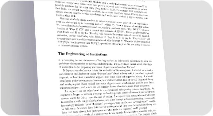 fraction of $1 required in trade for the asset “Pays $x” can be interpreted as a market estimate of E[x]. Similarly, the fraction of the asset “Pays $1 if C” traded for the asset “Pays $x if C” can be interpreted as a market estimate of E[x|C]. Since 1996, the Iowa Electronic Markets have actually had markets whose prices could be combined to represent estimates of each party’s expected vote fraction conditional on various possible nominees for the other party (Berg & Rietz, 2003). For example, 1996 prices indicated that Dole, the actual Republican nominee, was a weak candidate against Clinton; there was always another candidate who speculators said would have received a higher expected vote fraction than Dole. One can similarly create markets to estimate whether a new policy N is an improvement over the status quo Q in increasing national welfare W. Given a measure of national welfare W,normalized to be between zero and one, markets that trade assets “Pays $W if N” for some fraction of “Pays $1 if N” give a market price estimate of E[W|N]. Just as people considering what fraction of $1 to pay for “Pays $x” will estimate the average value of x across all plausible scenarios, people considering what fraction of “Pays $1 if N” to pay for “Pays $x if N” will average only over plausible scenarios consistent with the event N. When the market estimate of E[W|N]isclearly greater than E[W|Q], speculators are saying that this new policy is expected to increase national welfare. The Engineering of Institutions It is tempting to use the success of betting markets as information institutions to solve the problems of democracies as information institutions. But do we know enough about either type of institution to be proposing new forms of government based on this idea? It depends on whether one thinks like a scientist or like an engineer. A scientist (or at least a caricature of one) insists on saying “I do not know” about a theory until it has robust empirical support, or has clear theoretical support from some other well-supported theory. A scientist thus bases policy recommendations only on relatively direct data, or on well-supported theory, and so stays quiet about radical new forms of government, which can not possibly have direct empirical support, and which are too complex for our theories to make direct predictions. An engineer, on the other hand, is more interested in improving systems than theory. An engineer is happy to work on a concept with a five percent chance of success, if the payoff from success would be thirty times the cost of trying. An engineer uses theory-informed intuitions to consider a wide range of design issues, and if the concept still seems promising, moves on to increasingly realistic “proof of concept” prototypes, from simulations, to “wind tunnel” models, to field tests. Scientists have little use for prototypes and their tests, being neither theory nor data that tests theory, but prototypes are what make the engineers’ world go round. While academic study of social systems is now mostly dominated by a scientific style, this paper takes an engineering style to consider a new form of governance. The purpose of this paper is not to induce high confidence that this concept would work well, but merely to raise readers’ confidence up to a level that would justify further exploration via the next level of prototype. This paper thus, from this point forward, mainly takes on an engineering tone, qualitatively identifying and addressing a wide range of design issues. 10