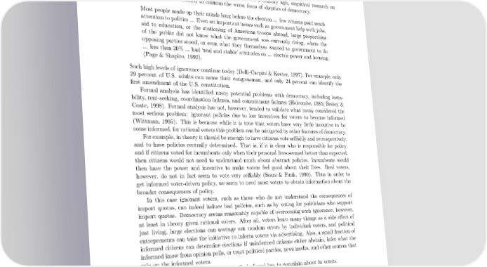 Information Failures of Democracy How well-informed is current democratic policy? Half a century ago, empirical research on individual U.S. voters seemed to confirm the worst fears of skeptics of democracy. Mostpeople made up their minds long before the election ... few citizens paid much attentionto politics ... Even on important issues such as government help with jobs, aid to education, or the stationing of American troops abroad, large proportions of the public did not know what the government was currently doing, where the opposing parties stood, or even what they themselves wanted to government to do ... less than 20% ... had ‘real and stable’ attitudes on ... electric power and housing (Page & Shapiro, 1992). Such high levels of ignorance continue today (Delli-Carpini & Keeter, 1997). For example, only 29 percent of U.S. adults can name their congressman, and only 24 percent can identify the first amendment of the U.S. constitution. Formal analysis has identified many potential problems with democracy, including insta- bility, rent-seeking, coordination failures, and commitment failures (Holcombe, 1985; Besley & Coate, 1998). Formal analysis has not, however, tended to validate what many considered the most serious problem: ignorant policies due to low incentives for voters to become informed (Wittman, 1995). This is because while it is true that voters have very little incentive to be comeinformed,forrationalvotersthis problemcanbe mitigatedbyother featuresof democracy. Forexample, intheoryit should be enough tohave citizens voteselfishly and retrospectively, and to have policies centrally determined. That is, if it is clear who is responsible for policy, andifcitizens voted for incumbents only when their personal lives seemed better than expected, then citizens would not need to understand much about abstract policies. Incumbents would then have the power and incentive to make voters feel good about their lives. Real voters, however, do not in fact seem to vote very selfishly (Sears & Funk, 1990). Thus in order to get informed voter-driven policy, we seem to need most voters to obtain information about the broader consequences of policy. In this case ignorant voters, such as those who do not understand the consequences of import quotas, can indeed induce bad policies, such as by voting for politicians who support import quotas. Democracy seems reasonably capable of overcoming such ignorance, however, at least in theory given rational voters. After all, voters learn many things as a side effect of just living, large elections can average out random errors by individual voters, and political entrepreneurs can take the initiative to inform voters via advertising. Also, a small fraction of informed citizens can determine elections if uninformed citizens either abstain, infer what the informed know from opinion polls, or trust political parties, news media, and other sources that rely on the informed voters. More recent empirical work has similarly found less to complain about in voters. Collective public opinion is rational [meaning] ... real, stable, differentiated, consis- tent, coherent; reflective of basic values and beliefs; and responsive (in predictable and reasonable ways) to new information and changing circumstances ... On most domestic matters, about which elites often compete and provide multiple sources of 3