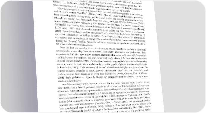 Betting and other speculative markets have been around for many centuries, and for many decades economists have studied the ability of such markets to aggregate information. The main finding of this research is that such markets tend to be relatively “efficient” in the sense that it is hard to find information that has not been incorporated into market prices (Lo, 1997; Hausch, Lo, & Ziemba, 1994). The main possible exceptions seem to be long-term aggregate price movements, and a long-shot bias in high-transaction-cost betting markets. Manyhavesuggestedthat asset marketshave too much long-termaggregateprice variation, such as stock market “bubbles” (Shiller, 2000). Risk and delay most discourage speculators from correcting such pricing errors, and irrational traders can actually gain superior returns (though not utility) from irrationally-large risk-taking (De Long, Shleifer, Summers, & Wald- mann, 1990). Long-term aggregate prices, however, are also where it is hardest to empirically distinguish irrationalityfrom rational informationabout fundamental economic change (Barsky & De Long, 1993), and where selection effects most pollute our data (Jorion & Goetzmann, 2000). Even if speculative markets are distorted by irrational bubbles, it is not clear that any of our other information institutions do better. For example, no other information institution in our society, such as academia or news media, consistently predicted that we were over-investing during the “dotcom” bubble. Yes some individual academics or reporters so predicted, but so did some individual stock investors. Over the last few decades economists have also studied speculative markets in laboratory experiments, where they have more control over trader information and preferences. Such experiments find that speculative markets aggregate information well, even with four traders trading $4 over four mintues, and even when such traders know little about their environment or other traders (Sunder, 1995). For example, traders can aggregateinformation well when they are experienced in their role and abstractly know the payoffs of players in other roles (Forsythe &Lundholm, 1990). If the structure of traders’ information is complex enough relative to the number of assets available to trade, however, information “traps” can occur where individual traders have no direct incentive to reveal their information (Noeth, Camerer, Plott, & Webber, 1999). Such problems are typically, though not always, reduced by allowing trading of more kinds of related assets. Absolute accuracy levels, however, are not the key issue. The key policy question about any institution is how it performs relative to alternative institutions dealing with the same situation. A few studies have presented field data on this question, directly comparing real world speculative marketswithother realworldinstitutionsfor aggregatinginformation. Forexample, racetrack market odds improve on the prediction of racetrack experts (Figlewski, 1979). Florida orange juice commodity futures improve on government weather forecasts (Roll, 1984), Oscar markets beat columnist forecasts (Pennock, Giles, & Nielsen, 2001), and gas demand markets beat gas demand experts (Spencer, 2004). Betting markets beat major national opinion polls 451outof596timesinpredictingU.S.presidentialelectionresults(Berg&Rietz, 2002). Finally, betting markets beat Hewlett Packard official forecasts 6 times out of 8 at predicting Hewlett Packard printer sales (Chen & Plott, 2002; Plott, 2000). Unfortunately, no studies have directly compared estimates from speculative markets to estimates from academic-style institutions We do know, however, that those who do best at betting on horse races are smart in ways they can not articulate, and in ways unrelated to I.Q. (Ceci & Liker, 1986). Academic-style institutions, in contrast, seem largely limited to 6