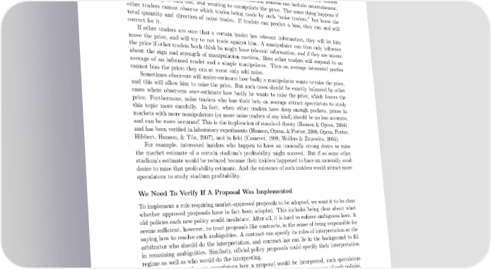 suspect that this new trader has new information. When other traders with deep pockets can clearly observe that a particular person is trading for non-information reasons, such traders will not allow the price to change. These non-information reasons can include entertainment, idiocy, needing to cash out, and wanting to manipulate the price. The same thing happens if other traders cannot observe which trades being made by such “noise traders,” but know the total quantity and direction of noise trades. If traders can predict a bias, they can and will correct for it. If other traders are sure that a certain trader has relevant information, they will let him move the price, and will try to not trade against him. A manipulator can thus only influence the price if other traders both think he might have relevant information, and if they are unsure about the sign and strength of manipulation motives. Here other traders will respond to an average of an informed trader and a simple manipulator. Thus on average interested parties cannot bias the price; they can at worst only add noise. Sometimes observers will under-estimate how badly a manipulator wants to raise the price, and this will allow him to raise the price. But such cases should be exactly balanced by other cases where observers over-estimate how badly he wants to raise the price, which lowers the price. Furthermore, noise traders who lose their bets on average attract speculators to study this topic more carefully. In fact, when other traders have deep enough pockets, prices in markets with more manipulators (or more noise traders of any kind) should be no less accurate, and can be more accurate! This is the implication of standard theory (Hanson & Oprea, 2004), andhasbeen verifiedin laboratoryexperiments (Hanson, Oprea, &Porter, 2006; Oprea, Porter, Hibbert, Hanson, & Tila, 2007), and in field (Camerer, 1998; Wolfers & Zitzewitz, 2004). For example, interested insiders who happen to have an unusually strong desire to raise the market estimate of a certain stadium’s profitability might succeed. But if so some other stadium’s estimatewouldbe reduced because their insiders happened to have an unusually weak desire to raise that profitability estimate. And the existence of such insiders would attract more speculators to study stadium profitability. WeNeedToVerify If A Proposal Was Implemented To implement a rule requiring market-approved proposals to be adopted, we want it to be clear whether approved proposals have in fact been adopted. This includes being clear about what old policies each new policy would invalidate. After all, it is hard to enforce ambiguous laws. It seems sufficient, however, to treat proposals like contracts, in the sense of being responsible for saying how to resolve such ambiguities. A contract can specify its rules of interpretation or the arbitrator who should do the interpretation, and contract law can lie in the background to fill in remaining ambiguities. Similarly, official policy proposals could specify their interpretation regime as well as who would do the interpreting. If it were not clear to speculators how a proposal would be interpreted, such speculators wouldhavetoaverageoverlikelyinterpretationsinestimatingthe consequences of such policies. An unclear proposal might be a sloppy but sincere attempt to improve national welfare, or an insincere attempt to slip in policies that would not be approved if proposed clearly. 18