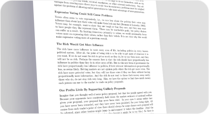 ernment described above does not overcome this problem, but it also does not obviously make this problem any worse. So perhaps we should continue with the current approach, which is to mostly only allow governments to commit if they can arrange to do so themselves, such as via transaction costs, posting bonds, external reputation, or other external institutions. Any ad- vantages from creating more direct ways to avoid time inconsistency problems must be weighed against the problem of allowing earlier generations to take more advantage of later generations. Expressive Voting Could Still Cause Problems Voters often seem to vote expressively, i.e., to care less about the policies their votes may influence than about how their votes will make them look and feel (Brennan & Lomasky, 1993). Voters may, for example, want to show they are tough or that they care, and they may want to have people they like represent them. These may be worthwhile goals, but policy choices can suffer as a result. By limiting democracy primarily to values, we would presumably focus voters more on expressing their values, rather than their beliefs. It is not clear why this would make expressive voting more of a problem overall. The Rich Would Get More Influence The rich have more influence in most every area of life, including politics in every known political system. After all, the point of being rich is to be able to get more of whatever it is you want. If we do not want the rich to get as much as they do, let us tax them more, and they will not be as rich. Perhaps the concern here is that the rich should have proportionally less influence in politics than they do in other areas of life. But in this new form of government the rich have proportionally less influence in politics, if their relevant information is proportionally less, as seems likely. Betting markets are not opinion polls where the rich get more votes. The rich have more potential votes, but they will lose those votes if they use them without having proportionally more information. And the rich do not tend to throw their money away easily; those who do, do not stay rich very long. Also, we have the option to limit how much money each person can use to the market to trade on policy proposals. One Profits Little By Supporting Unlikely Proposals Imagine that you thought well of some policy proposal, but that few people agreed with you. Because your opponents have consistently held down the market estimate of national welfare given your proposal, your proposal has never been tried. In your eyes it seems unfair that you have never been rewarded, and they have never been punished, for your being right. Of course from each trader’s point of view there should always be some chance each proposal will be adopted, since other traders might jump in and support it before the deadline. (And the smaller the chances of the proposal passing, the cheaper it might be to try this.) So there is always some possible reward from trading on unlikely proposals, though with finite transaction costs this incentive might not be enough. Every known political system has a similar problem. Supporters of contrarian proposals might first try them out on smaller scales, perhaps by getting other speculators to allow local regimes where such proposals can be tried. Also, the insights that tell you why your proposal 16