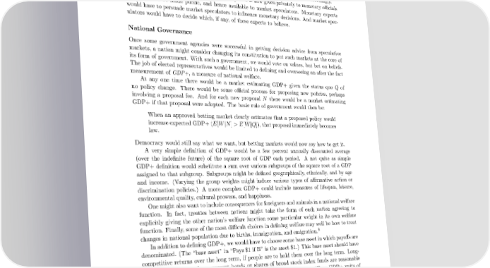 either change was made. If either the up or the down market had a consistently higher price over that week than the same market, interest rates would be raised or lowered accordingly. Information about the state of the economy that is now given privately to monetary officials could instead be made public, and hence available to market speculators. Monetary experts would have to persuade market speculators to influence monetary decisions. And market spec- ulators would have to decide which, if any, of these experts to believe. National Governance Once some government agencies were successful in getting decision advice from speculative markets, a nation might consider changing its constitution to put such markets at the core of its form of government. With such a government, we would vote on values, but bet on beliefs. The job of elected representatives would be limited to defining and overseeing an after the fact measurement of GDP+, a measure of national welfare. At any one time there would be a market estimating GDP+ given the status quo Q of no policy change. There would be some official process for proposing new policies, perhaps involving a proposal fee. And for each new proposal N there would be a market estimating GDP+ifthat proposal were adopted. The basic rule of government would then be: When an approved betting market clearly estimates that a proposed policy would increase expected GDP+ (E[W|N]> E[W|Q]),thatproposal immediatelybecomes law. Democracy would still say what we want, but betting markets would now say how to get it. A very simple definition of GDP+ would be a few percent annually discounted average (over the indefinite future) of the square root of GDP each period. A not quite as simple GDP+definition would substitute a sum over various subgroups of the square root of a GDP assigned to that subgroup. Subgroups might be defined geographically, ethnically, and by age and income. (Varying the group weights might induce various types of affirmative action or discrimination policies.) A more complex GDP+ could include measures of lifespan, leisure, environmental quality, cultural prowess, and happiness. Onemightalsowanttoincludeconsequences forforeignersand animalsina nationalwelfare function. In fact, treaties between nations might take the form of each nation agreeing to explicitly giving the other nation’s welfare function some particular weight in its own welfare function. Finally, some of the most difficult choices in defining welfare may well be how to treat changes in national population due to births, immigration, and emigration.8 In addition to defining GDP+, we would have to choose some base asset in which payoffsare denominated. (The “base asset” in “Pays $1 if B” is the asset $1.) This base asset should have competitive returns over the long term, if people are to hold them over the long term. Long- term inflation-indexed government bonds or shares of broad stock index funds are reasonable choices. The national welfare assets traded would then be of the form “Pays GDP+ units of the base asset.” So if the base asset were index fund shares, then once GDP+ was determined to be 0.127, each welfare asset could be exchanged for 0.127 index fund shares. 8We might, for example, give a 10% relative weight to any person anywhere, and a 50% weight to our allies, possible children, and likely immigrants and emigrants. 13