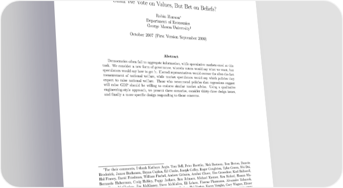 Shall We Vote on Values, But Bet on Beliefs? ∗ Robin Hanson Department of Economics George Mason University† October 2007 (First Version September 2000) Abstract Democracies often fail to aggregate information, while speculative markets excel at this task. We consider a new form of governance, wherein voters would say what we want, but speculators would say how to get it. Elected representatives would oversee the after-the-fact measurement of national welfare, while market speculators would say which policies they expect to raise national welfare. Those who recommend policies that regressions suggest will raise GDP should be willing to endorse similar market advice. Using a qualitative engineering-style approach, we present three scenarios, consider thirty-three design issues, and finally a more specific design responding to those concerns. ∗For their comments, I thank Kathryn Aegis, Tom Bell, Peter Boettke, Nick Bostrom, Tom Breton, Damein Broderick, James Buchanan, Bryan Caplan, Ed Clarke, Joseph Coffey, Roger Congleton, Tyler Cowen, Wei Dai, Hal Finney, David Friedman, William Fischel, Andrew Gelman, Amihai Glazer, Tim Groseclose, Karl Hallowell, Bernardo Huberman, Craig Hubley, Peggy Jackson, Ron Johnson, Michael Kremer, Ken Koford, Hassan Ma- sum, Peter McCluskey, Jim McKinney, Steve McMullen, Eli Lehrer, Florenz Plassmann, Alexander Tabarrok, “TheRob,” Earl Thompson, Nicolaus Tideman, Norm Tucker, Hal Varian, Karen Vaughn, Gary Wagner, Eliezer Yudkowsky, Richard Zeckhauser, and participants of the Monomedia Berlin: Value conference, the 2000 GMU Public Choice Outreach Seminar, and the 2001 Public Choice Society annual meeting. I thank the Center for Study of Public Choice and the Mercatus Center for financial support, and Edward Stringham for research assistance. †rhanson@gmu.edu http://hanson.gmu.edu 703-993-2326 FAX: 703-993-2323 MSN 1D3, Carow Hall, Fairfax VA22030 1